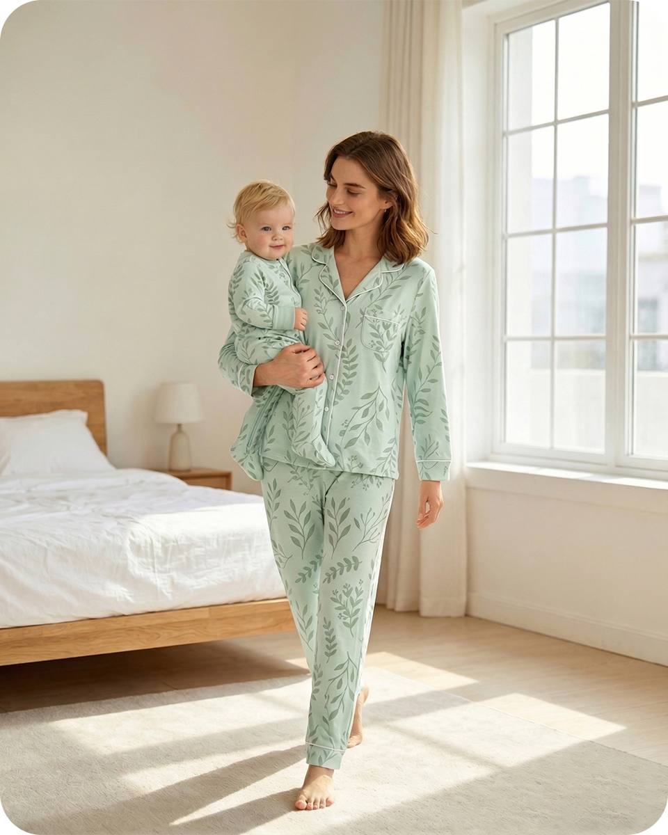 • Leaf Print Matching Set – Stylish mommy and baby sleepwear look.